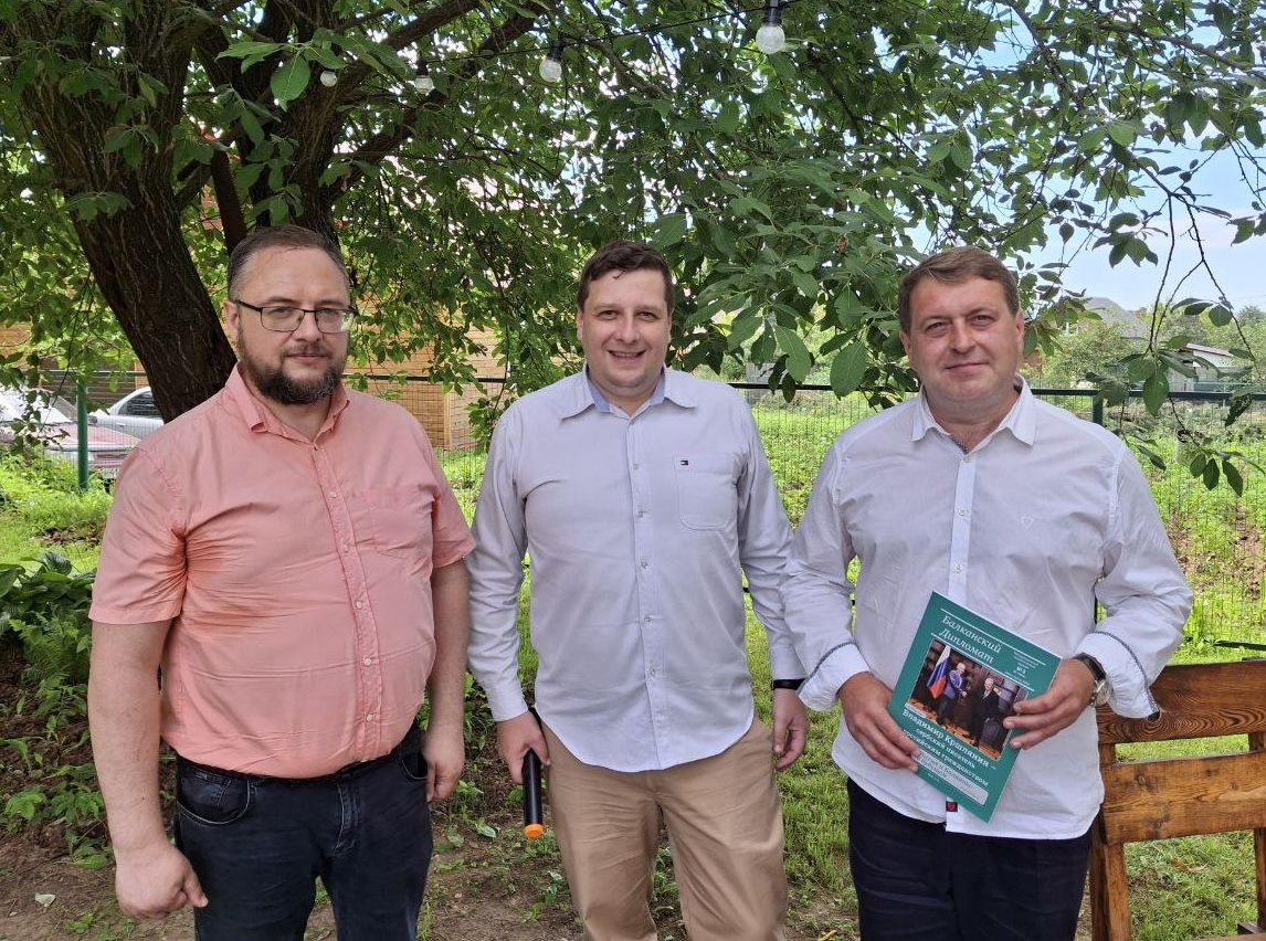 Настоятель Храма Пётр Сургучев, руководитель Представительства Российского исторического общества в Республике Сербской Драга Мастилович и студент ИвГУ Богдан Мастилович в селе Сараево