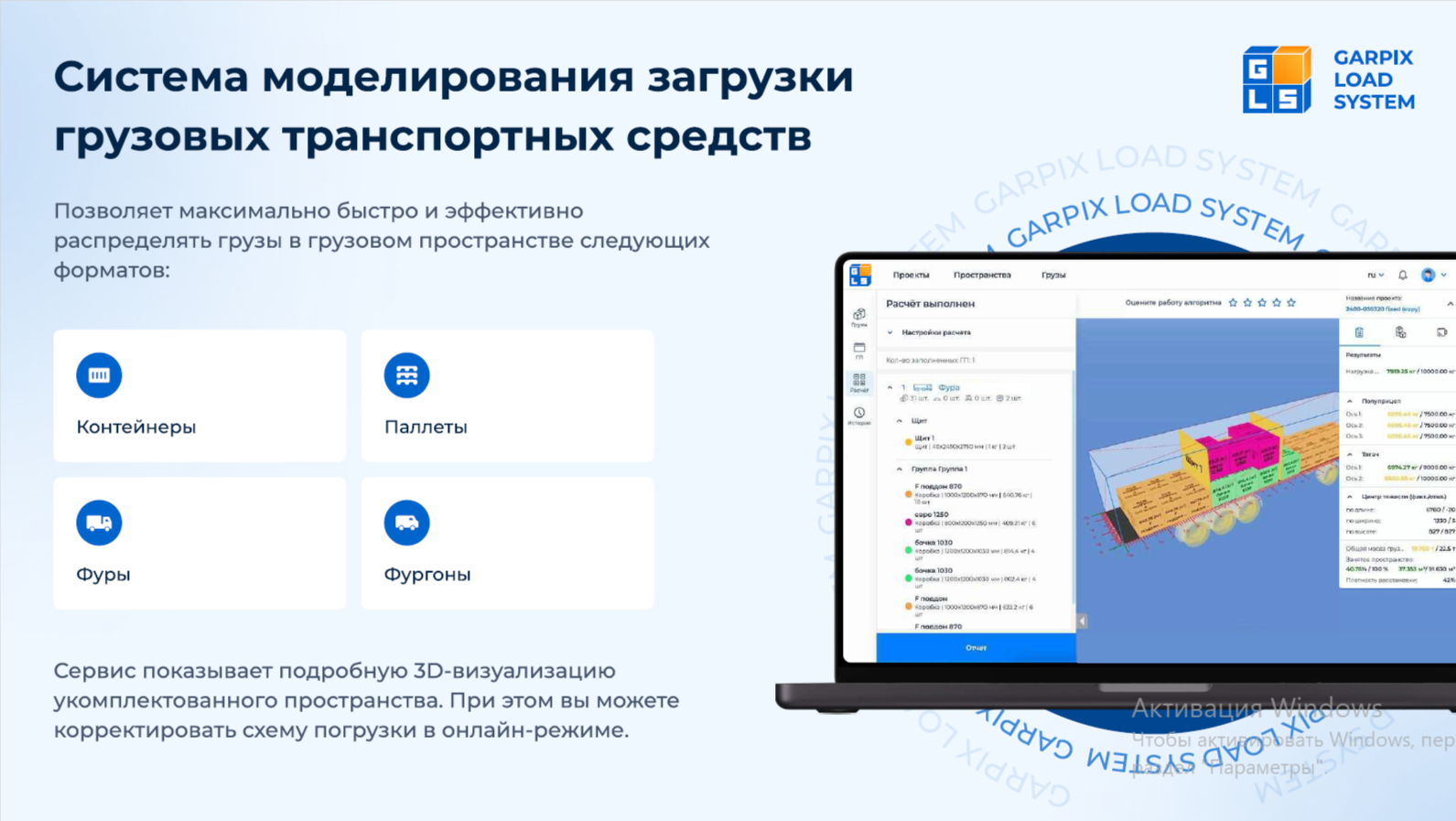 GARPIX LOAD SYSTEM (GLS) – это программное обеспечение для планирования загрузки контейнеров, грузовиков, паллет, речного/морского судна и других транспортных средств.